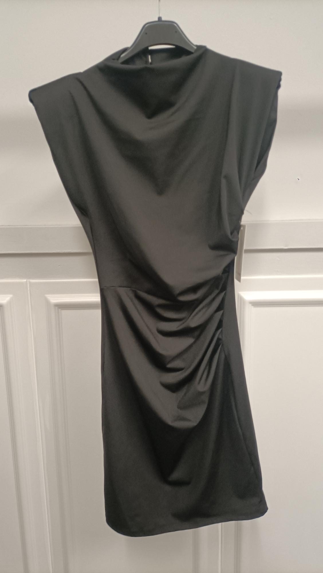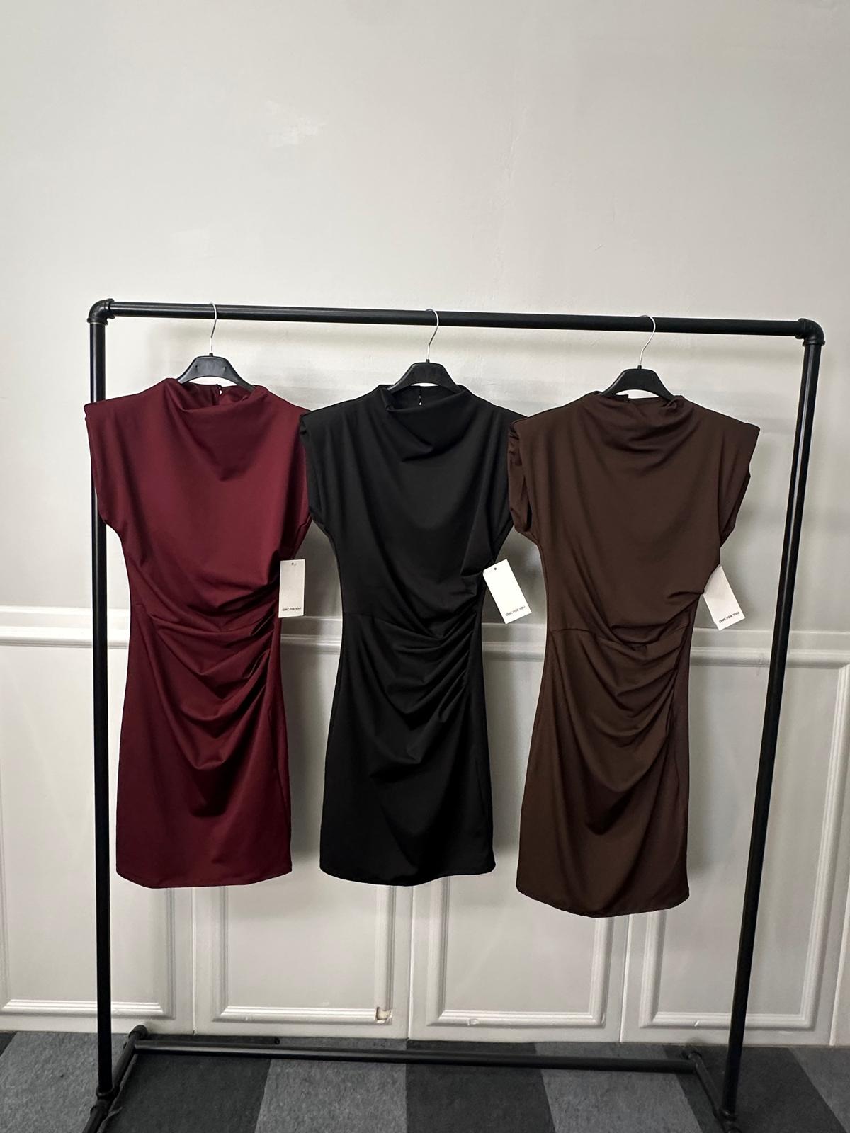 Il punto focale è l'arricciatura strategica sul fianco sinistro 💃: questa lavorazione non solo aggiunge un tocco di design scultoreo, ma modella e scolpisce la zona della vita e dei fianchi in modo incredibile. Lo scollo accollato dona sofisticatezza e bilancia perfettamente la lunghezza mini dell'abito. Per un tocco di lusso inatteso, la chiusura sul retro è adornata da due bottoni cromati luccicanti, un dettaglio chic che cattura lo sguardo.