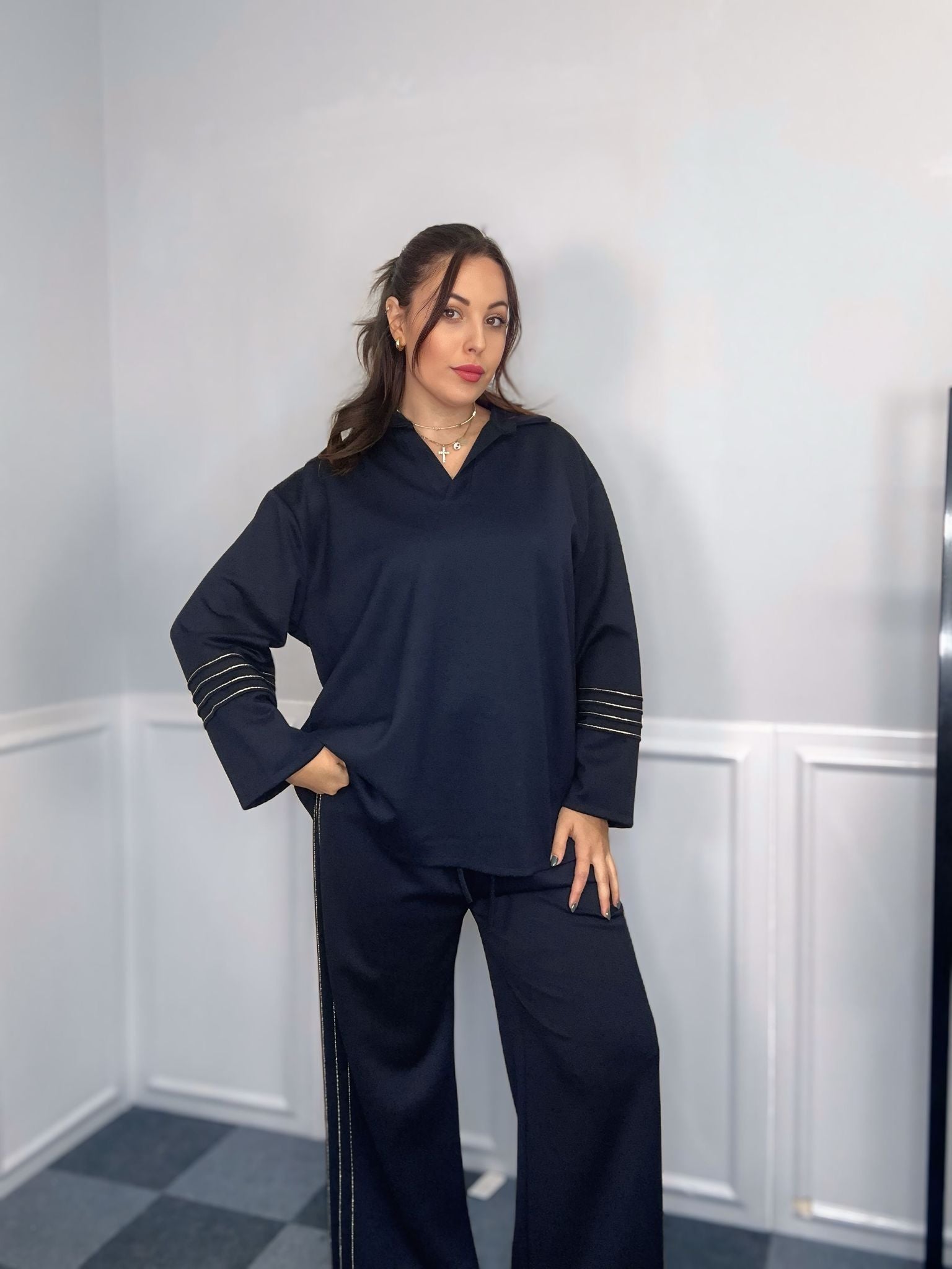 Il comfort è la nostra priorità: la felpa calda e avvolgente ti assicura il massimo relax. I pantaloni palazzo con elastico in vita offrono una vestibilità fluida, mentre la maglia a scollo tondo ha un fit perfetto.
