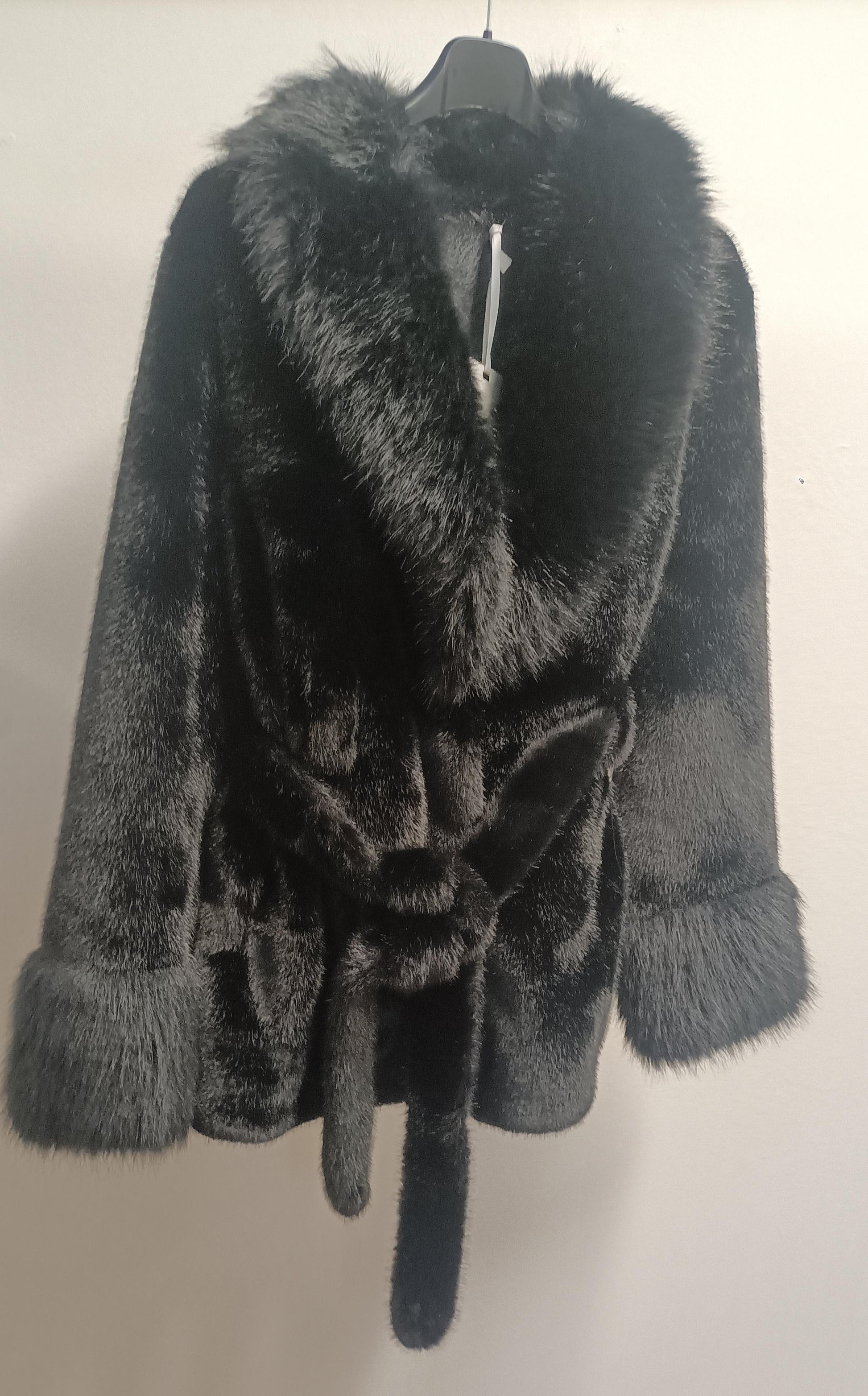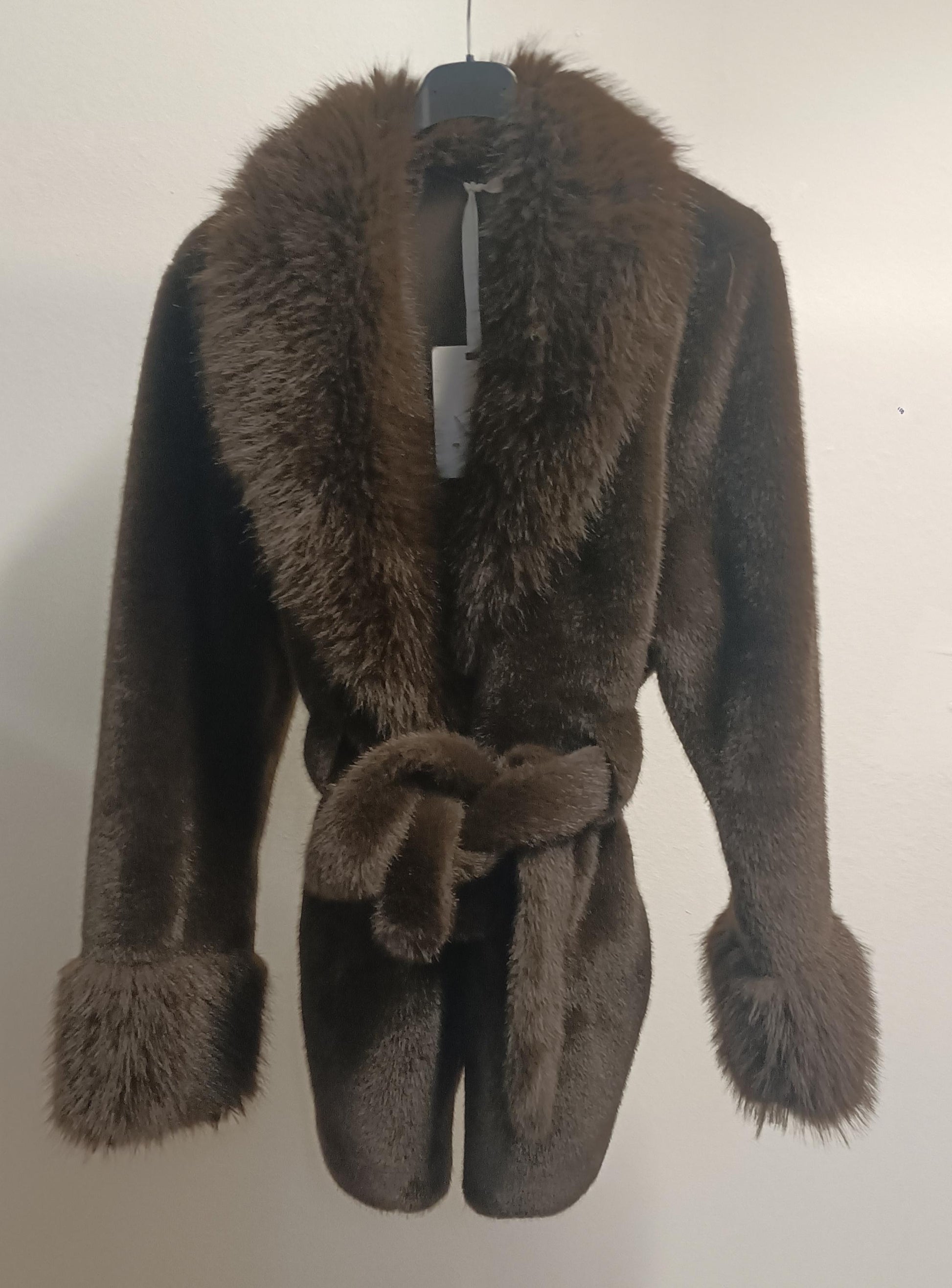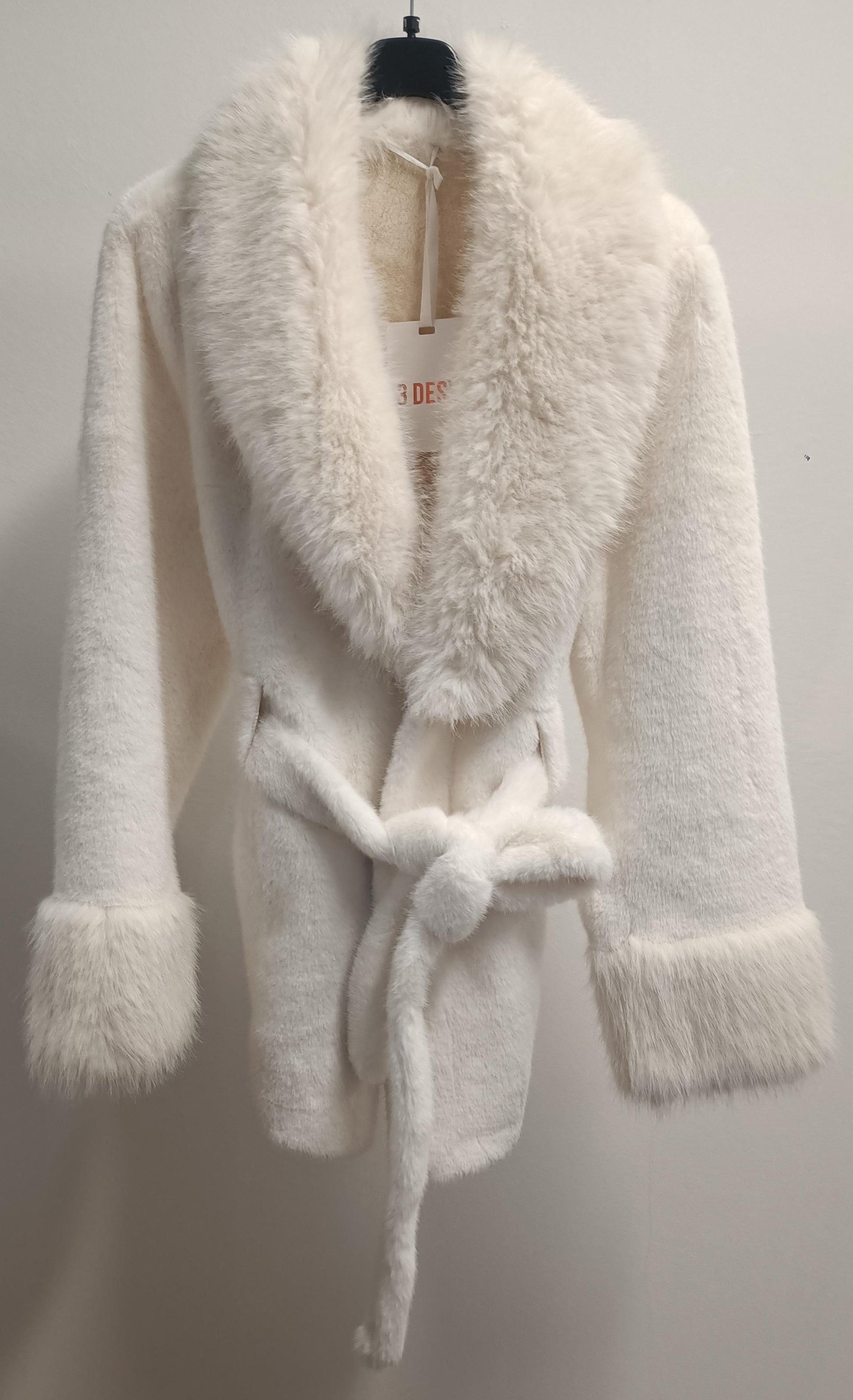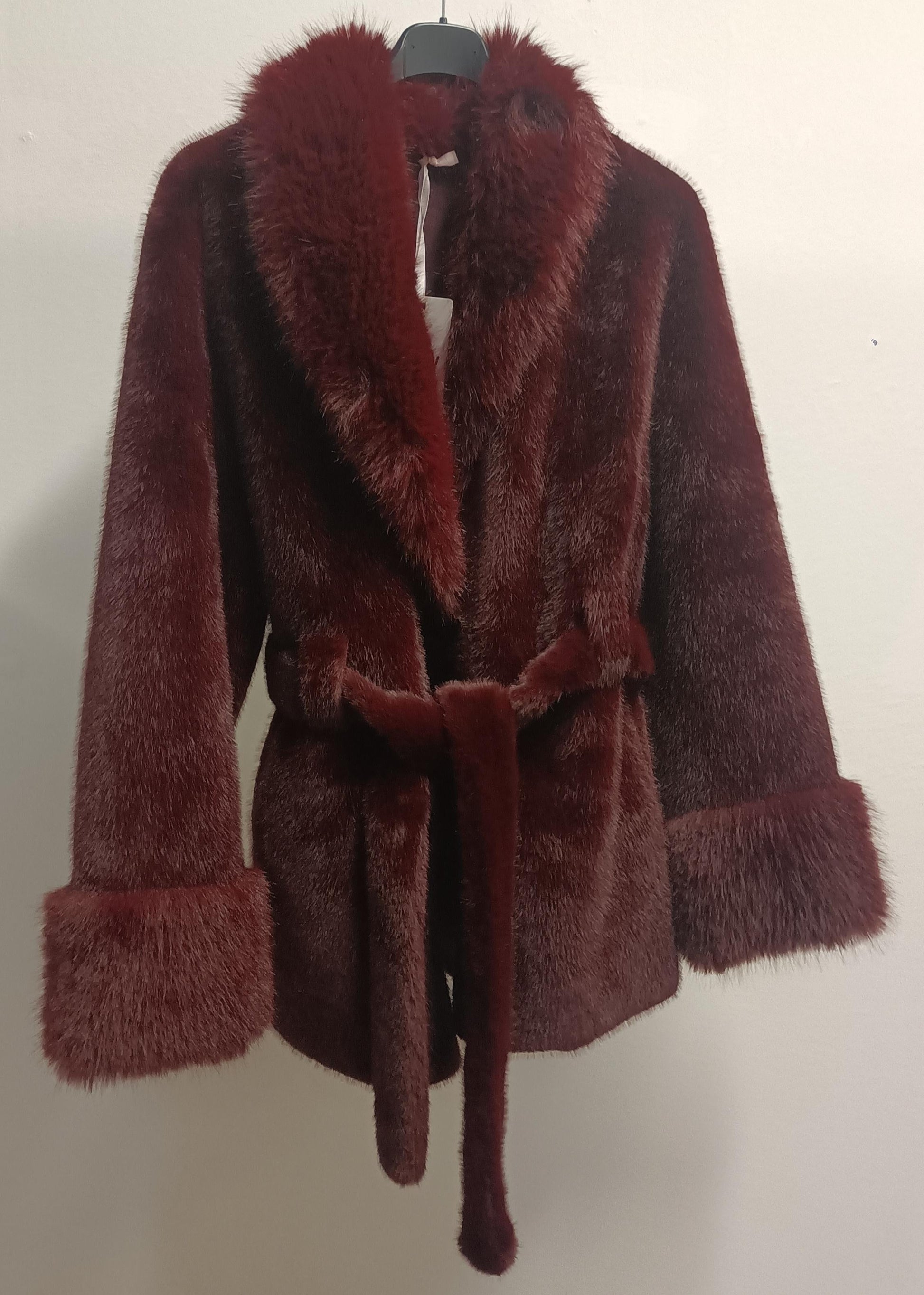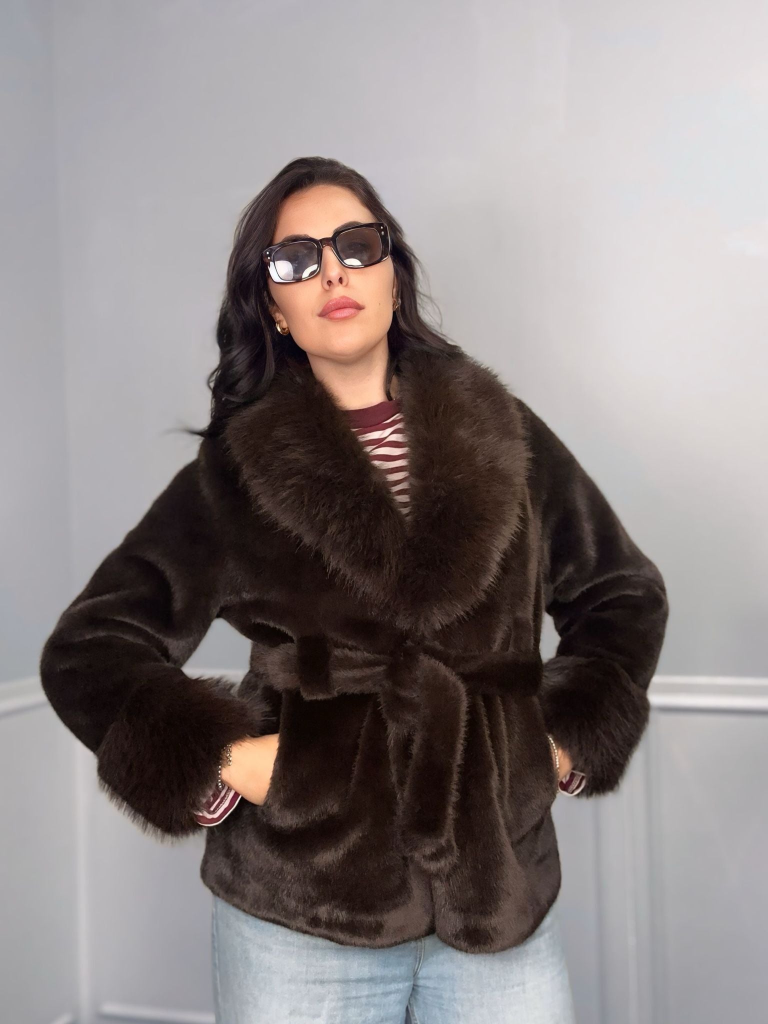 Il design è studiato per la massima femminilità: il collo sciallato crea una scollatura elegante, mentre la vestibilità avvitata è garantita dalla cinta nello stesso materiale (ecopelliccia), che definisce il punto vita in modo chic. I polsini sono rifiniti con pelo leggermente più lungo per un tocco extra-glam e avvolgente. Le maniche lunghe a guanto 👋 completano l'effetto cozy e di tendenza. Indossala e senti il glamour a portata di mano!