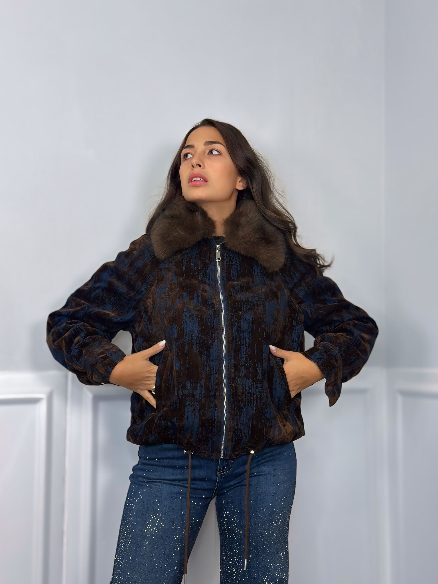 Il design ibrido presenta una base in tessuto jeans (o con dettagli effetto jeans) abbinata a sezioni in marrone per un contrasto cromatico ricco e di tendenza. Il pezzo forte è il sontuoso collo in morbida pelliccia marrone, che aggiunge un tocco di lusso e garantisce un calore imbattibile.