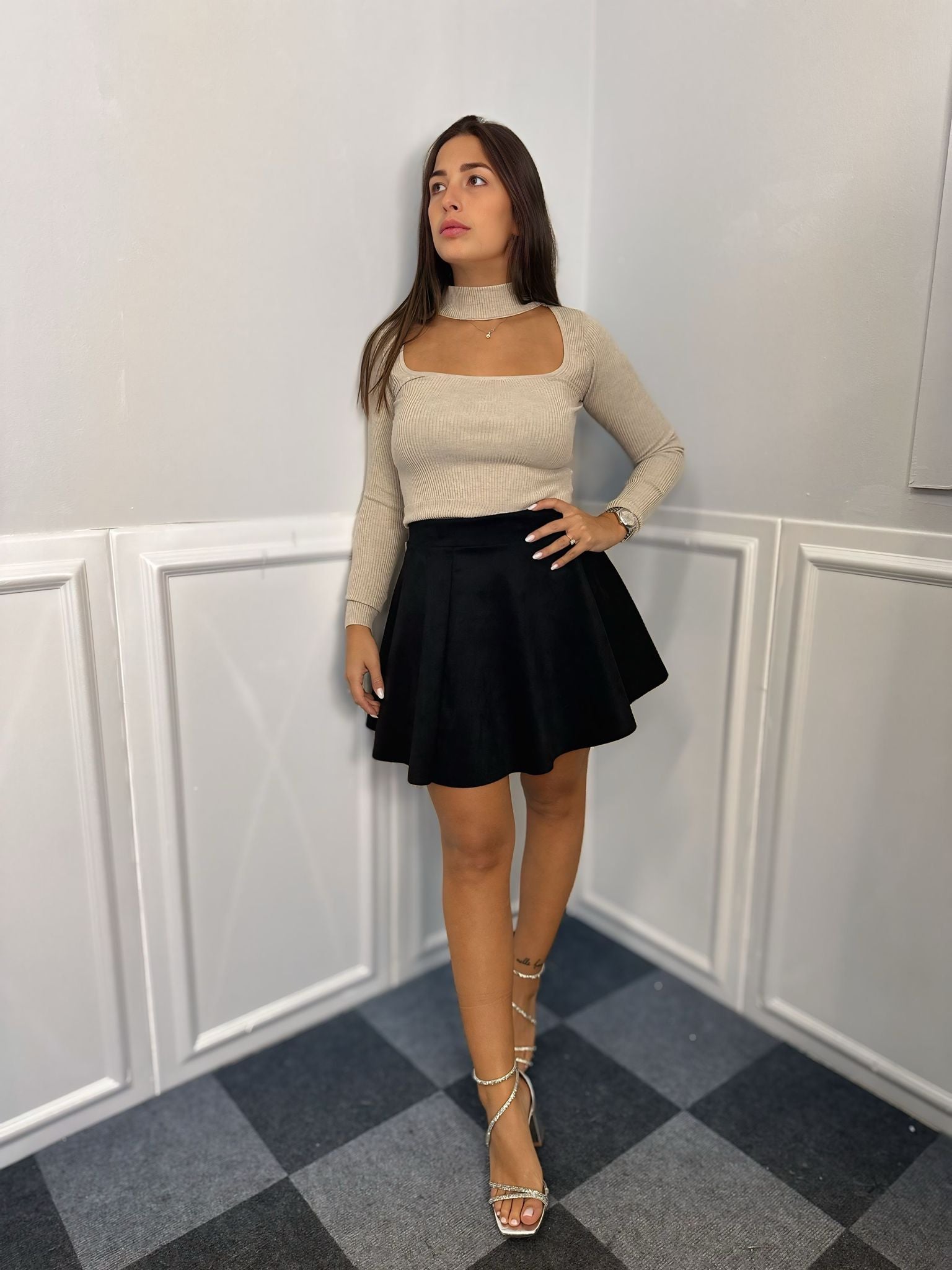 Vuoi aggiungere un capo versatile e alla moda al tuo guardaroba? Questa gonnellina è la scelta perfetta! Il suo tessuto effetto scamosciato le conferisce un aspetto raffinato e morbido, mentre il design a piegoni la rende dinamica e giocosa.
