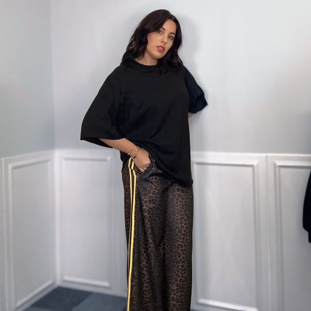 Lasciati avvolgere dall'irresistibile effetto raso, liscio e luminoso, che accarezza la pelle e dona un fit impeccabile. La stampa maculata (o leopardata) iconica è qui rivisitata e resa unica dalle righe laterali colorate a contrasto: un tocco sporty-chic inaspettato che fonde lusso e tendenza streetwear.