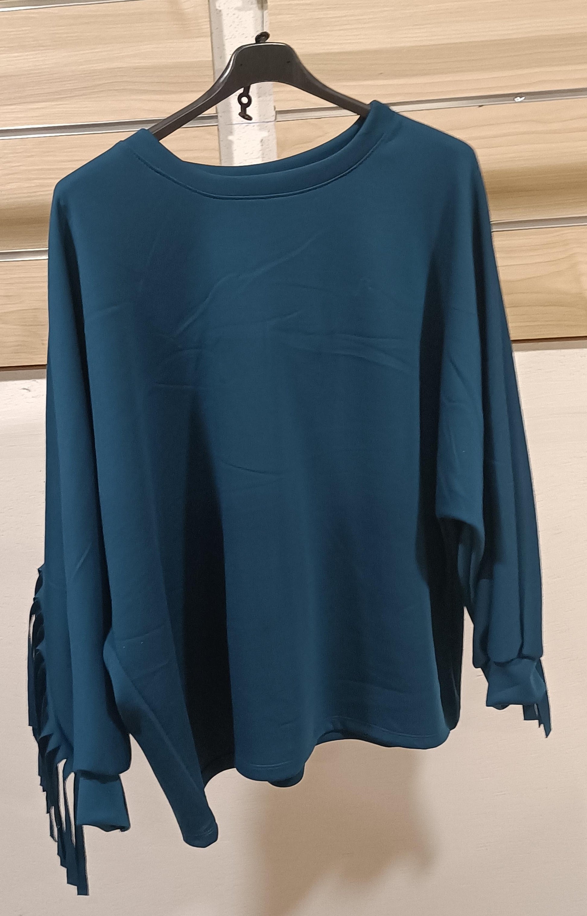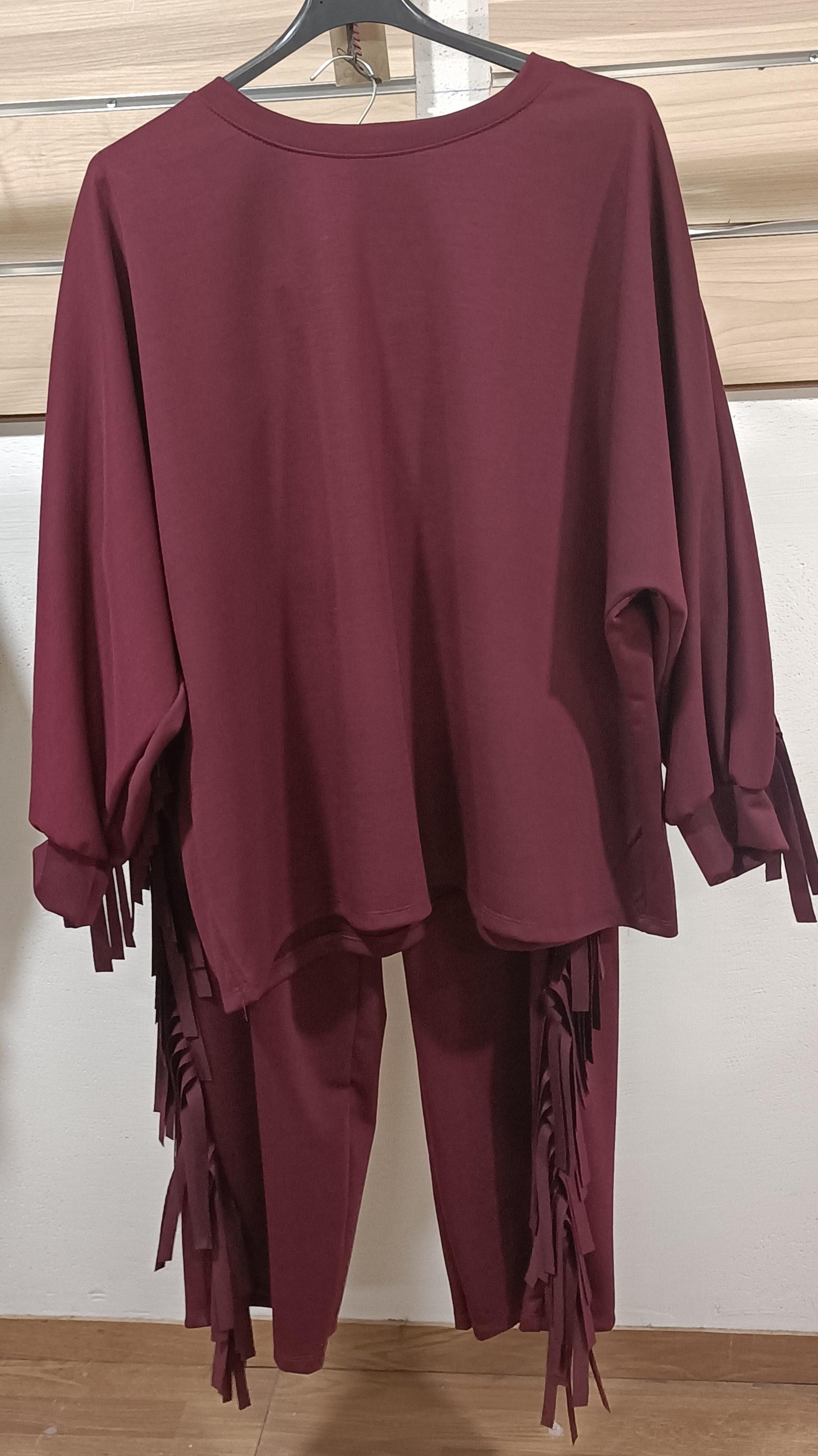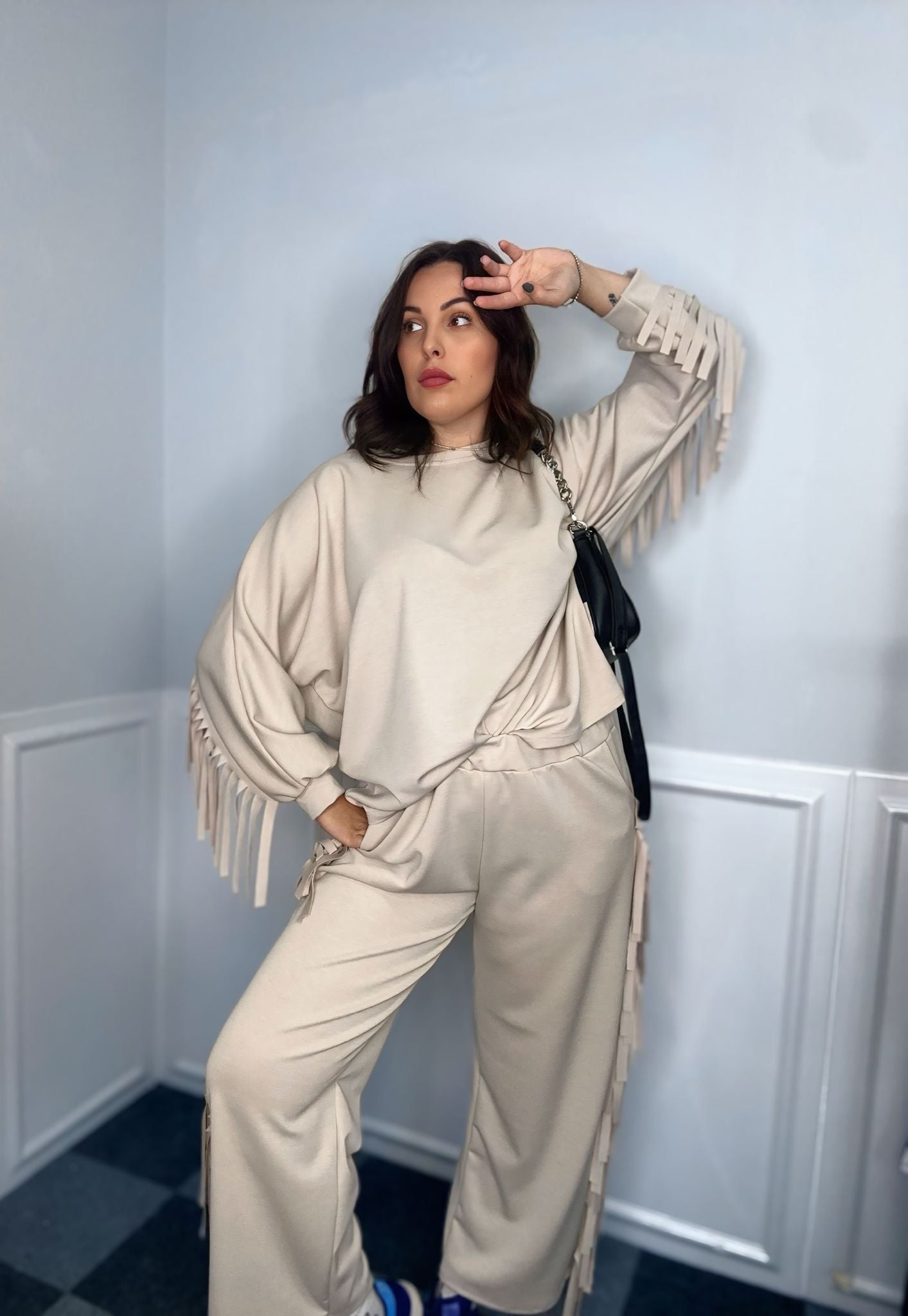 La maglia girocollo e i pantaloni tipo tuta con elastico in vita offrono una vestibilità comodissima e avvolgente. Il vero tocco di magia, però, è la decorazione di frange dello stesso colore che borda con eleganza ogni capo. Questo dettaglio dinamico e trendy trasforma il completo da semplice lounge wear in un outfit d'impatto, perfetto per le giornate casalinghe o per un'uscita casual ma ricercata.